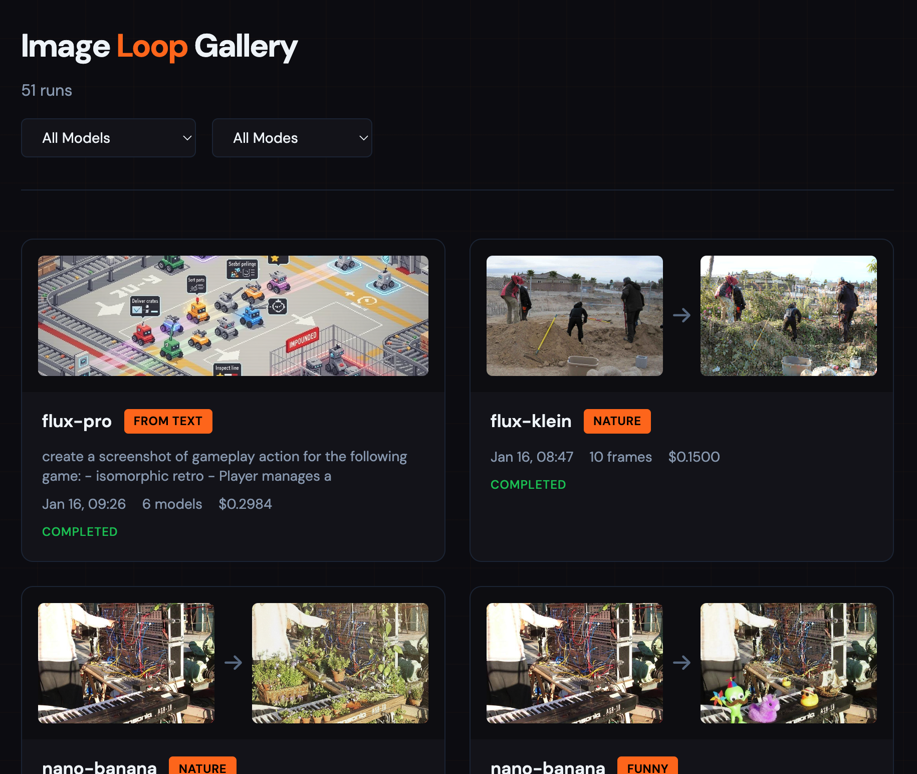 The tool does quite a lot: it tracks metadata like costs, processing time and tokens. It handles model selection, image sizing and aspect ration, saving images, gif and videos, and interruption/continuation of running jobs. It also comes with a gallery viewer which helps to inspect results and filter by model or prompt.