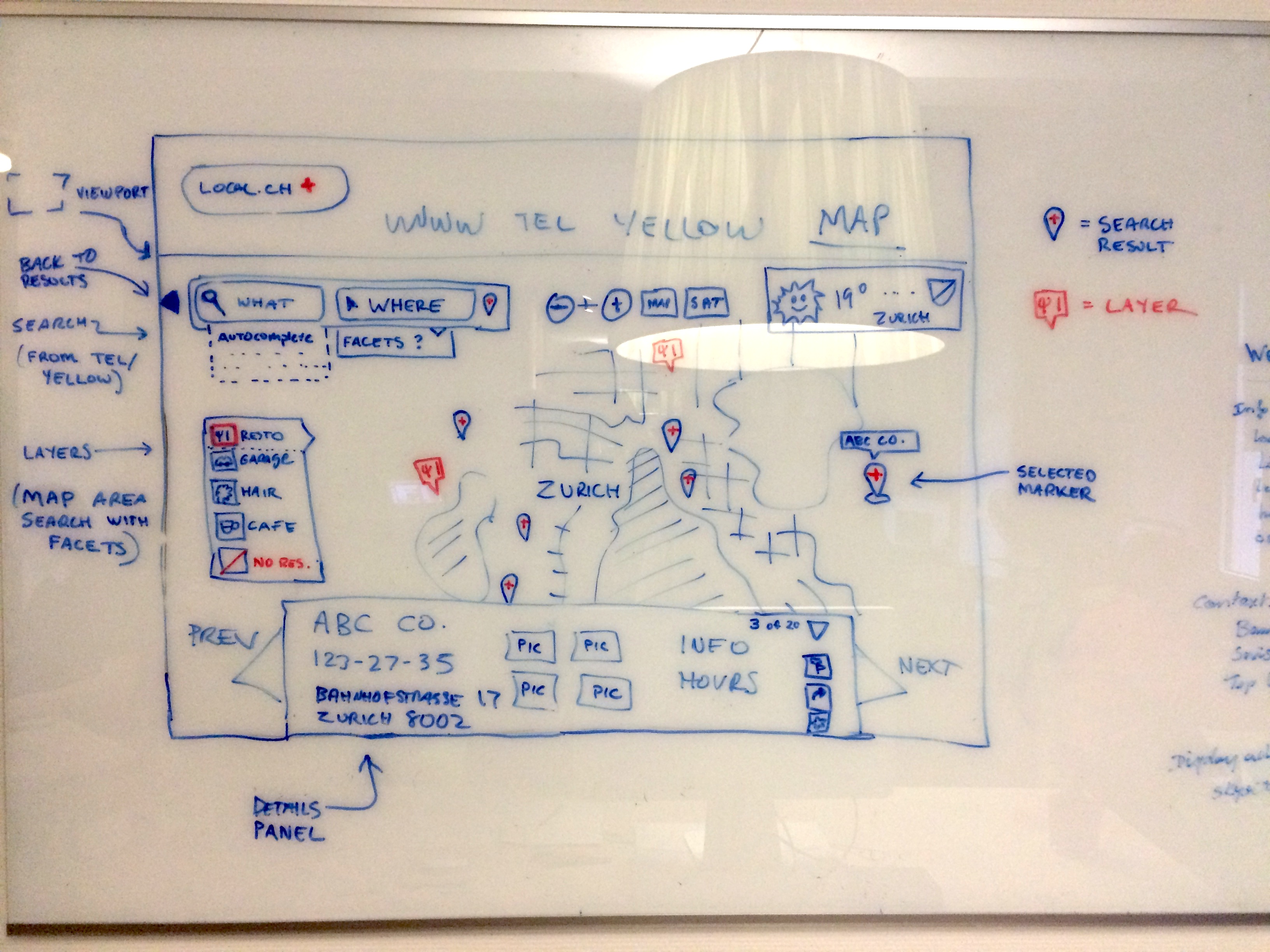 Starting in late 2012, I became team lead for the web engineers, and started working closely with product owners in designing new features. The new local.ch map was challenging, because it involved coordinating the user stories and engineering tasks, together with external design, new search features, and a whole new approach to the front-end stack (namely, Google Maps and backbone.js .)
